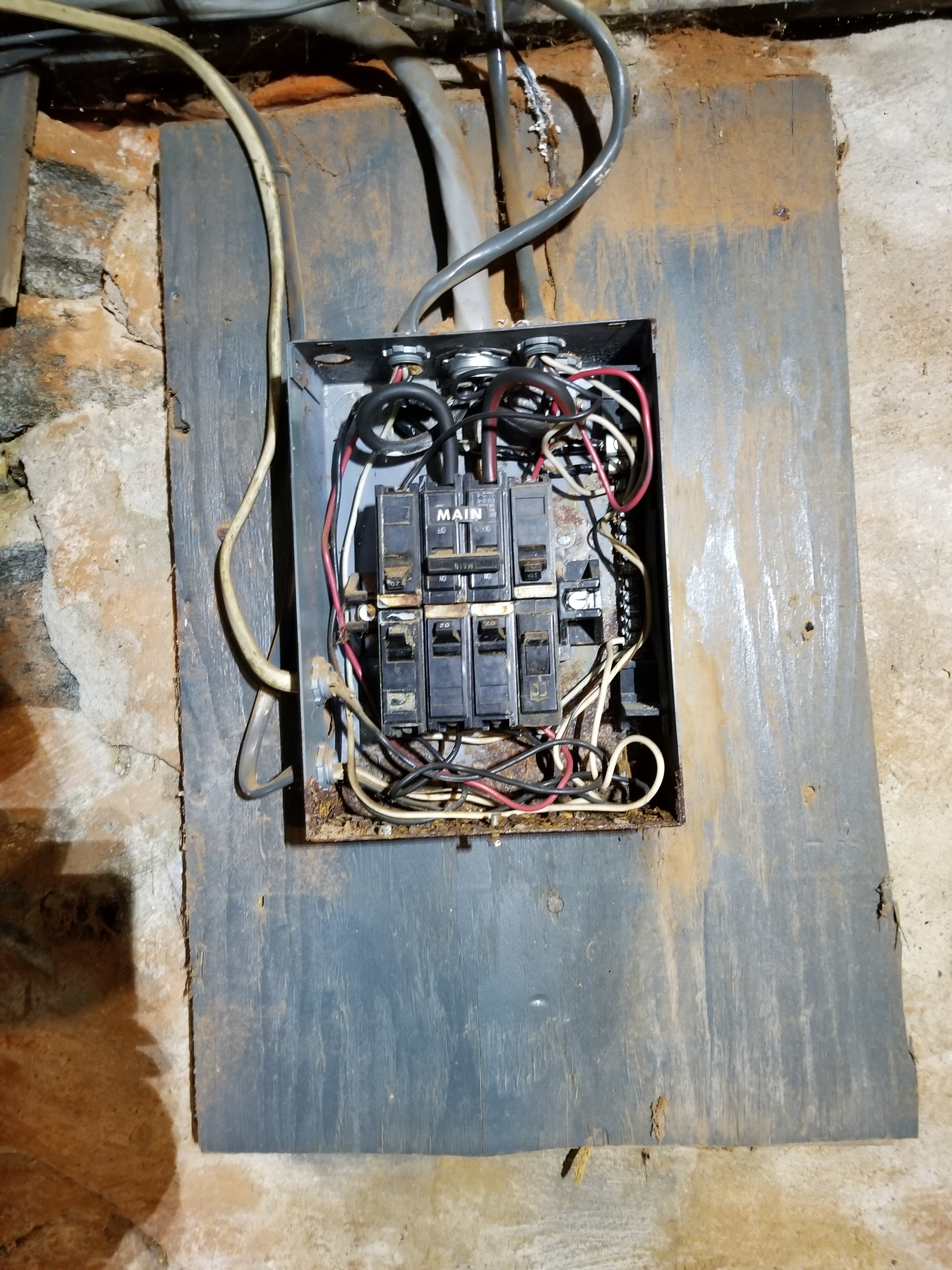 Initially the customer wanted to install 2 new circuits, 1 in the living room and 1, in the dining room. This issue here was the previous panel didn’t allow for FUTURE EXPANSION, the system wasn’t grounded via electrode, the mounting board wasn’t ¾” plywood and was rickety as hell. In addition it was completely rusted out which renders it as unsalvageable.